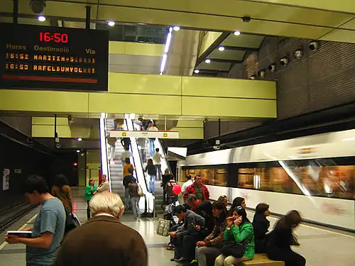 Colón[a] (Valencian: Colom,[b] mostly referred as Colón[b]) is a metro station of the Metrovalencia network in Valencia, Spain. It is situated on Carrer de Colom, in the southeastern part of the city centre. The station is a tall underground structure with a single island platform serving all four lines.