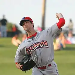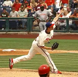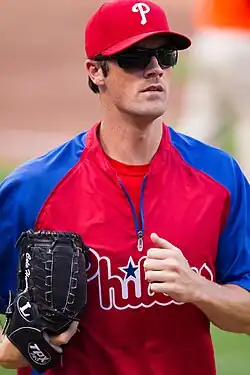 Entering the 2010 season, the Phillies traded away Cliff Lee, but in doing so, acquired Roy Halladay in a "mega-trade".[58] They did not re-sign Myers,[59] and Halladay was named the Phillies' opening day starter.[60] Among Hamels' season highlights were a start on June 7 against the San Diego Padres during which he threw 6+13 innings of no-hit baseball, winning five consecutive starts including three consecutive scoreless starts from late-August to mid-September, and striking out 13 batters, tied for his second-highest career total, on September 13 against the Florida Marlins.[12]