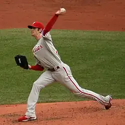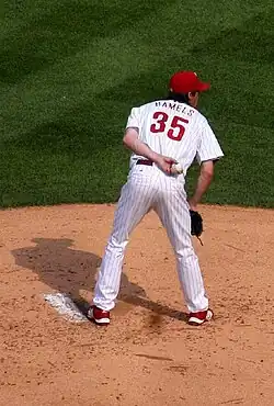 For his strong performance during the first half of the season, Hamels was, for the first time in his career, selected a member of the NL All Star Team.[24] As Hamels had been the Phillies' only consistent starter to that point, even to the point that one columnist said the Phillies are a joke "as long as we are forced to look forward to someone other than Cole Hamels on the mound",[25] the Phillies acquired Kyle Lohse to supplement the rotation soon before the trading deadline.[26] Several weeks later, Hamels was placed on the 15-day disabled list (DL) with a mild left elbow strain. After the Phillies activated him from the DL, on September 28, he helped the Phillies take over first place in the National League East by striking out 13 Washington Nationals over eight innings in a 6–0 win.[27] Two days later, the team clinched a spot in the playoffs for the first time in 14 years.[28] In the first game of the National League Division Series, he started for the Phillies, but surrendered three runs, three hits, and an "uncharacteristic" four walks, while striking out seven in 6+23 innings; he was assessed the loss.[29] Ultimately, the Phillies lost the series. Hamels finished with a regular-season record of 15–5, a 3.39 ERA, and 177 strikeouts in 183+13 innings. The Philadelphia chapter of the Baseball Writers' Association of America (BBWAA) presented him the "Steve Carlton Most Valuable Pitcher" award.[30]