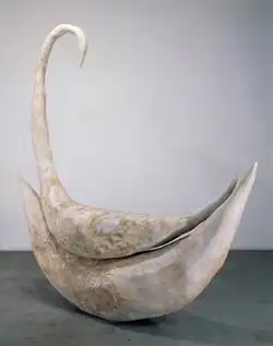 In the later 1980s, Sterritt shifted toward work with smoother surfaces and restrained color, that some writers compare favorably to the work of Martin Puryear or Louise Bourgeois.[8][1] She also undertook greater compositional challenges and expression of movement, that critic Colin Gardner wrote "synthesized classical balance with rugged, idiosyncratic kinesis,"[39] such as Full Quintet (1985),[34] Endear (1987), or Pike: For Earl the Pearl[40] (1988).[41][32] Others recognized greater psychological tenderness and a "quasi-humorous pathos" in her ungainly, "lovable ugly ducklings,"[41] such as the swan-like Flush (1991), which features two forms in relation to explore issues of sexuality and desire, including separation and union, embrace and entrapment.[32][42][3]