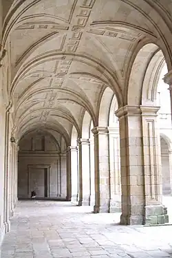 The cloister was built on a Doric-Romanic style with 22 meters of length from side to side. The cloister is supported by heavy pillars of one and a half meters high and surrounds a yard, covered with groined vaults and rosettes that fall between the ribs intersections. In the top-middle of each pillar four different shields represent the different contributors to the building: the first shield represents the Cardinal Rodrigo de Castro; the second one refers to Casa de Lemos; the third one belongs to the Casa de Alba; and the last one stand for Escuelas Pias, representing the contribution of the Piarists Fathers.