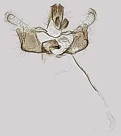 The wingspan is 10–15 mm. The moth's head is white, as are the antennae which are ringed with pale brownish. It has a basal joint with rather short tuft. The labial palps and forewings are also white. The veins are faintly yellowish-tinged, near apex more fuscous; costal edge anteriorly finely dark fuscous, near apex more strongly; costal cilia fuscous or dark fuscous except at base and tips. Hindwings rather dark grey.[2] Keys and description [3] Only reliably identified by dissection and microscopic examination of the genitalia.