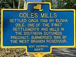 Coles Mills was a grist mill and small hamlet on the West Branch of the Croton River in Kent, New York. One of the first settlements in the Southern Precinct of Dutchess County, now Putnam County, in the state of New York, it features prominently on the 19th Century maps of the area including the 1854 R. F. O’Connor Map of Putnam County,[1] the 1867 F.W. Beers Map,[2] and the United States Geological Survey map from 1892.[3] The mill and surrounding area was purchased by the New York City water supply system and submerged during the construction of West Branch Reservoir in the 1890s.