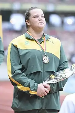 In April 2025, she won both the discus (57.94m) and shot put with 18.14m, three 3cm away from the national record, and won silver in the hammer throw (65.53m), at the 2025 South African Athletics Championships.[8][9] The following month, she won in the shot put (17.16 metres), hammer throw (65.32 metres), and discus (55.48 metres) at the University Sport South Africa (USSA) Championship in May 2025.[10] In July 2025, she won the bronze medal in the shot put at the 2025 Summer World University Games in Bochum, Germany.[11]