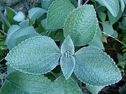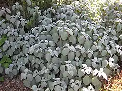 Growing to 1 m (3 ft) tall and broad, it is a spreading deciduous shrub. The hairy leaves are ovate to broad-ovate, 5–11.5 cm long, 3–5.5 cm wide with crenate margins. The hairs give the plant an overall sage green to silvery colour.