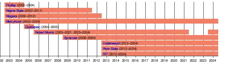 - ^ RMU dropped men's hockey at the same time it dropped the women's team. The men's team also resumed play in 2023, rejoining its former men's home of Atlantic Hockey.