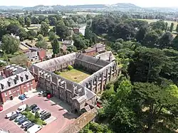 The college building stands to the south-east of the cathedral. Its earliest parts date from c. 1473, when Bishop Stanberry had the college moved from Castle Street a short distance to the east. It takes the form of a quadrangle, with four two-storey ranges around a central courtyard; the courtyard-facing elevations of the ranges contain a cloister on their ground floor. There is an early seventeenth century chapel in the east range, and a late seventeenth century hall projects south from the south range. The college is connected to the cathedral by a corridor, probably of late fifteenth-century date, which runs between the north-west corner of the former and the south-west transept of the latter.[4]