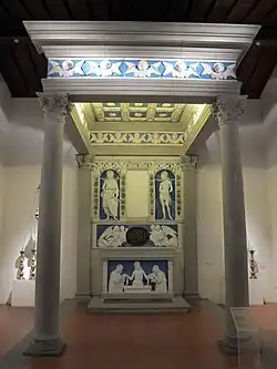 In the museum are a number of artworks, including a stern stone relief portrait of Leo X (circa 1550); a 16th-century painted terracota depicting St Antony Abbott; and there are portions of a fresco painted by Luberto da Montevarchi depicting the Birth of Christ and an Enthroned Madonna and child. There are various reliquaries used to transport the relics of the Holy Milk during processions. But the main object on display is the reconstructed Tempietto della reliquia del sacro latte (1495–1500) by Andrea della Robbia.[2][3][4]