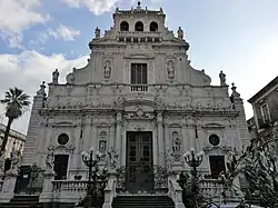 Completed during 1608–1658, the church was also frescoed by Venerando Costanzo and Baldassare Grasso. The 1693 earthquake collapsed the choir, the sacristy and the oratory. Reconstruction was quick taking place mainly between 1695 and 1699. The facade in white stone from Syracuse was designed by Angelo Bellofiore, and completed between 1705 and 1715. In front of the facade is a highly decorated balustrade with ten statues. The row of saints depicts San Gervasio and San Lorenzo to the left, and San Vito and San Protasio to the right. Above are statues of the brothers Santi Cosma and Damiano. The facade itself is richly festooned with sculptural decorations of putti and masks. The metal portal gates of the atrium were completed by Salvatore Paradiso in 1848, while the bronze bas-reliefs of the central door were designed by Gustave Doré in 1893.
