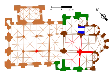 Many of the vault keystones in the transept and nave are unfinished, a condition previously interpreted as evidence of an incomplete medieval construction. However, these features are now understood to result from 18th-century repairs that were either left unfinished or intentionally simplified.[Bl 9]