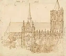 The current Brabantine Gothic building was erected in stages, mostly from around 1350 to 1527.[2][3] At that time, Anderlecht was still a village in the outskirts of Brussels counting barely 300 inhabitants.[6][10] Built in the centre of the village, the church was intended for gatherings much bigger than just the parish community, hence its large size.[6][11] Hendrik de Mol was responsible for the works from 1443, succeeding his friend Gillis Joos.[12] De Mol was in turn succeeded by Jan van Ruysbroeck, the court architect of Philip the Good,[12][13] who also designed the tower of Brussels' Town Hall.[12][14] Van Ruysbroeck mainly oversaw the construction of the choir in the 1460s. After him, Jan van Evergem took over the works in 1485, followed by his son Hendrik. The famous master builder Louis van Bodeghem, the architect behind the Royal Monastery of Brou at Bourg-en-Bresse, France, designed the portal. From 1517, Matthijs III Keldermans worked on the originally square tower up to the balcony, as well as the side chapels. Construction was still underway in 1527.[12]