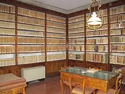 The Observatory houses two specialized libraries, one ancient and one modern, rooms for measuring equipment and numerous historical collections (especially instruments for radio transmissions, astronomical and meteorological observations, seismological instruments), arranged in such a way as to be able to be used as a historical-didactic path. There is also a reproduction of the first internal combustion engine in history, by Barsanti Matteucci. The premises contain some important works of the Florentine sixteenth and seventeenth centuries, albeit in undervalued locations, near the stairwell. Among these are Giovanni Bizzelli's Sant'Elena (1587), San Girolamo supported by an angels, among the masterpieces of Jacopo Ligozzi, and an Immaculate Conception by Francesco Curradi.[4]