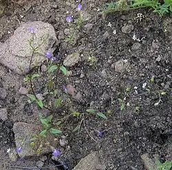 This is an annual herb growing up to 40 centimeters tall with a spindly stem coated in fine hairs. The leaves are lance-shaped and may have dull teeth along the edges. Each flower is 4 to 10 millimeters long and is borne on a long pedicel.