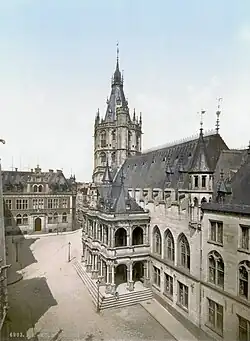 The City Hall is located on the site of the former Ancient Roman Praetorium, which until the year 475 was seat of the Roman Governor of Germania Inferior. Merovingian kings are known to have used the praetorium as a regia until 754, however the building was ultimately destroyed by an earthquake in the late 8th century.[3] Under Hildebold of Cologne, the city was elevated from a bishop's to an archbishop's see in 795, and the area around the former praetorium has become home to both a group of wealthy Patrician merchants and Cologne's Jewish community, many of whom were under immunity granted by the king.