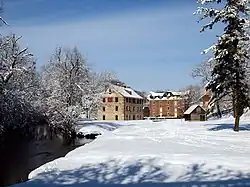 The Grist Mill underwent several building iterations before it became the building known today as the Luckenbach Mill. The original wooden flour mill was built in 1743 and due to flood damage was later replaced by a limestone structure in 1751.[2] This building was destroyed by a fire in 1869 and the building seen today was erected later that year, though portions of the 1751 mill's north and east walls are still visible. The mill remained one of the longest-lasting industries in the Colonial Industrial Quarter, receiving modern upgrades of steam power in 1877, an Allis roller mill system in 1882, and a 25,000 bushel grain elevator in 1893.[2] The Luckenbach Mill was in continuous use well into the 20th century, gradually switching from flour to grain before all milling ceased in 1949. It was purchased in 1952 by an auto parts dealer who turned the whole Colonial Industrial Quarter area into an automobile junkyard.[12] The building was restored in 1982. Presently the structure houses event and educational space as well as the Library and Archives for Historic Bethlehem Museums & Sites.[13]