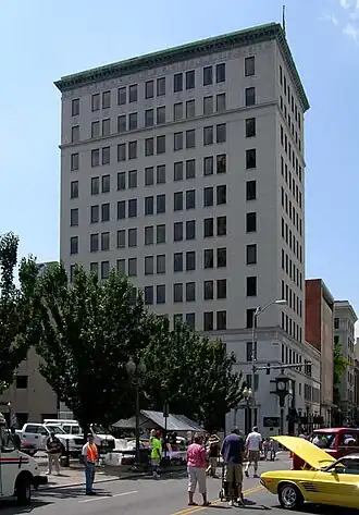 In its place the organization built the current structure, a 12-story building done in the Neoclassical style.[3] The new building was designed by Frye and Stone, a local architecture firm responsible for many buildings that would become Roanoke landmarks.[3] The firm followed the contemporary trend with skyscraper construction, creating a structure that mimicked a three-part classical column in its design.[3] The first three stories, or base, are constructed of granite ashlar; the middle seven stories, or shaft, are gray brick, and the top two stories, or capital, are ornamented brick.[3] In a modern twist on the building's Neoclassical design, its Campbell Avenue side features five large windows on the lower two floors. [3]
