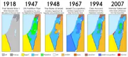 Change in the borders of Israel and Palestine over time, showing the extent of Israeli control of territory formerly identified as Palestine.