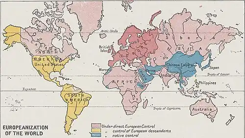 Decolonization, which started in the 18th century, gradually led to the independence of colonies in waves, with a particular large wave of decolonizations happening in the aftermath of World War II between 1945 and 1975.[15][16] Colonialism has a persistent impact on a wide range of modern outcomes, as scholars have shown that variations in colonial institutions can account for variations in economic development,[17][18][19] regime types,[20][21] and state capacity.[22][23] Some academics have used the term neocolonialism to describe the continuation or imposition of elements of colonial rule through indirect means in the contemporary period.[24][25]