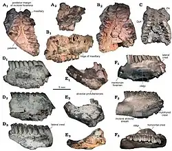 The Miocene formations cropping out onshore have provided a rich mammal fauna. The Arroyo Chasicó Formation is the defining formation for the Late Miocene Chasicoan South American land mammal age, ranging from 10 to 9 million years ago.[25] The formation contains many mammal species, birds and reptiles.[26] The Cerro Azul Formation contains fossils of the rodents Chasichimys bonaerense,[27] Neocavia pampeana,[28] Reigechimys plesiodon and R. simplex,[29] the armadillos Chasicotatus ameghinoi,[23] and Macrochorobates scalabrinii,[27] and the opossum Zygolestes tatei,[30] among other mammals. The Río Negro Formation has provided fossils of the glyptodont Plohophorus figuratus.[31]