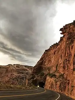Colorado National Monument is a National Park Service unit near the city of Grand Junction, Colorado. Sheer-walled canyons cut deep into sandstone and granite–gneiss–schist rock formations. This is an area of desert land high on the Colorado Plateau, with pinyon and juniper forests on the plateau. The park hosts a wide range of wildlife, including red-tailed hawks, golden eagles, ravens, jays, desert bighorn sheep, and coyotes.[3] Activities include hiking, horseback riding, road bicycling, and scenic drives; a visitor center on the west side contains a natural history museum and gift shop. There are scenic views from trails, Rim Rock Drive, which winds along the plateau, and the campground.[4] Nearby are the Book Cliffs and the largest flat-topped mountain in the world, the Grand Mesa.