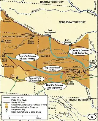 The Colorado War was an Indian War fought in 1864 and 1865 between the Southern Cheyenne, Arapaho, and allied Brulé and Oglala Lakota (or Sioux) peoples versus the U.S. Army, Colorado militia, and white settlers in Colorado Territory and adjacent regions. The Kiowa and the Comanche played a minor role in actions that occurred in the southern part of the Territory along the Arkansas River.[1] The Cheyenne, Arapaho, and Lakota Sioux played the major role in actions that occurred north of the Arkansas River and along the South Platte River, the Great Platte River Road, and the eastern portion of the Overland Trail. The United States government and Colorado Territory authorities participated through the 1st Colorado Cavalry Regiment, often called the Colorado volunteers. The war was centered on the Colorado Eastern Plains, extending eastward into Kansas and Nebraska.