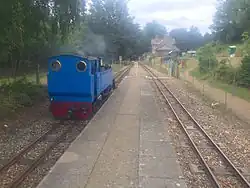The line from Wroxham to Aylsham was reopened in 1990 as a narrow gauge railway. The station at Coltishall was reopened as part of this development.[3] The station is a request stop, although many trains are obliged to stop here as it is also a passing place on the single-track railway. There are two platforms. The station is located near to the village of Coltishall, although some distance from its main tourist destinations, the former RAF Coltishall airbase, and the staithe.[4]