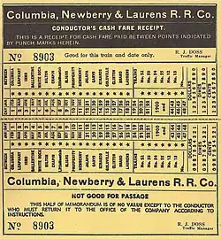 A ticket for a passenger service on the Columbia, S.C., Newberry and Laurens Railroad, date unknown.