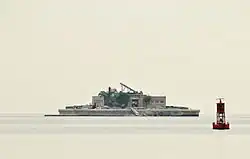The island is only about 150 by 150 feet and almost all of its space is taken up by a concrete bunker that formerly housed TV transmission equipment for CBS (Columbia Broadcasting Service), hence the island's name. From afar you might think it resembles a mini Alcatraz.