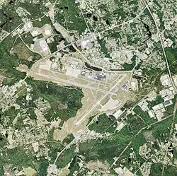 The airport covers 2,600 acres (1,100 ha) and has two runways: 11/29 is 8,601 ft × 150 ft (2,622 m × 46 m) and 5/23 is 8,001 ft × 150 ft (2,439 m × 46 m). It has a 50 ft × 50 ft (15 m × 15 m) helipad. The center 75 ft (23 m) of runway 5/23 is asphalt; the edges are grooved concrete.[1][5]