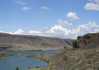 The Pleistocene Lake Basins ecoregion is a nearly level to undulating lake plain that contained vast temporary Pleistocene lakes that were created by flood waters from glacial lakes Missoula and Columbia. In Oregon, the flood waters accumulated from the eastern entrance of the Columbia River Gorge upstream to the Wallula Gap to form ancient Lake Condon. Elevation varies from 300 to 1,200 feet (90 to 370 m). Today, the region is the driest and warmest part of the Columbia Plateau, with mean annual precipitation varying from 7 to 10 inches (180 to 250 mm). Major irrigation projects provide Columbia River water to the region, allowing the conversion of large areas into agriculture. Where present, native vegetation consists of needle-and-thread, Indian ricegrass, bluebunch wheatgrass, Sandberg bluegrass, and basin big sagebrush. Alien cheatgrass covers broad areas. The largest of the Columbia Plateau subregions, the Pleistocene Lake Basins covers 1,407 square miles (3,644 km2) in Eastern Oregon and larger areas in Washington, encompassing lower elevations throughout the Mid-Columbia Basin. It includes part of the Yakama Indian Reservation, as well as public lands within the Umatilla, Cold Springs, McNary, and Columbia national wildlife refuges, the Hanford Nuclear Site, and the Hanford Reach National Monument.[2][4]