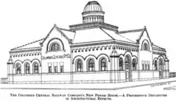 The building was part of a complex of a power plant and streetcar barn (the Columbus Central Street Railway Car Depot and Power House) during its operation; those buildings have since been demolished.[2][4] The power house, built in 1894, was a large building of cut stone, brick, and terra cotta, measuring 100 by 100 ft. The building had a pyramidal roof with large dormers on each side and a flat skylight in the center, surrounded by a balustrade, and with a central ornamental cupola.[5] The building was also designed by architects Yost & Packard.[6][7] The building was noted as a unique take away from the norm of power plants at the time; this structure was designed to hide its industrial uses, including its large smokestack.[5]