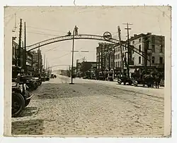 Arches were first used on streets in Columbus in 1888. The Grand Army of the Republic (G.A.R.), a national veterans organization, held its 22nd annual convention in the city that year, bringing about 250,000 people to the city that had held a population of about 90,000. Tent cities were put up around Columbus, so the city erected 25 wooden arches, gas-lit, to support their safety and security at night.[1] The arches spanned High Street for about 7,400 ft (2,300 m), from Union Station south to Livingston Avenue.[2] The event also included a parade of 90,000 veterans down High Street, the largest for Union soldiers since the Civil War. The parade route passed under numerous of these arches on High Street.[1][3]