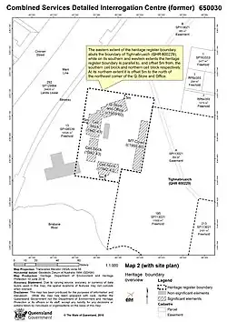 - ^ a b c d e f g h i j k l m n o p q r s t u v w x y z aa ab ac ad ae af ag ah ai aj ak al am an ao ap aq ar as at au av aw ax ay az ba bb bc bd be bf bg bh bi bj bk bl bm bn bo bp "Combined Services Detailed Interrogation Centre (former) (entry 650030)". Queensland Heritage Register. Queensland Heritage Council. Retrieved 20 February 2018.