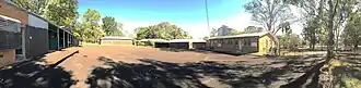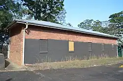 Two more buildings (extant in 2016) were added to the Provost headquarters c. 1959–1960, forming a complex around the perimeter of the former POW exercise yard, which at some point was sealed with bitumen as a parade ground.[58][59] The two new buildings are not on a September 1959 aerial, but are present on a December 1960 aerial photographs.[60] The arrangement of buildings around a central parade ground is a characteristic of Australian Army barracks.[3] One building was a Q-store (Quartermaster's store) and Office, built north of the exercise yard. This had a Q-Store at the west end, a security room (possibly a secure room for the Q-Store) and duty room (guard room), orderly room (administration office), investigation AWOL section, and rooms for the OC (Officer Commanding) and RSM (Regimental Sergeant Major) at the east end.[61] In 1961 the Q-Store, highset on brick piers, was described as being 72 by 32 feet (21.9 by 9.8 m), with a corrugated galvanised iron roof; brick walls; hardwood and concrete floors; cement rendered lining; hardboard, brick and louvre partitions, and hardboard and FAC (Flat Asbestos Cement?) ceilings.[62][1]