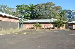 More buildings were added, and some were removed, between 1944 and 1946. The layout of the prisoner's compound – with three cell blocks, two small buildings to the north and one small building to the southwest – is visible in a 1946 aerial. By this time the Masonite huts had gone; there was a new building south of the QM store, and there were three additional buildings east of Tighnabruaich and the translating building. The buildings of the prisoners' compound are finally shown on a 1948 plan. The latter shows that by 1948 small lean-to porches existed at the north end of the western section of the western (north and central) cell blocks; and at the west end of the southern section of the southern cell block.[41][42] All of the WWII additions to the site, apart from the three cell blocks, were gradually removed by the late 1950s. A c. 1950 plan indicates that some WWII buildings had already been removed.[43] More were sold in 1957–58 (NAA: J56, QL470: "Indooroopilly – ex-interrogation centre – Tignabruiach. Wilton House – Residence Northern Command" (1943–1958)), and all were gone by 1959.[44] Although the c. 1950 plan is labelled "Indooroopilly barracks", this term does not seem to be used in any other files or plans from the 1950s to the 1970s.[1]