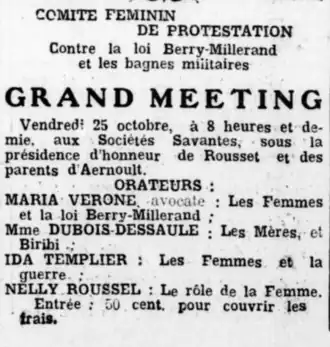 During their demonstration on 1 May 1913, several members were arrested by the police.[3] On 25 May 1913, the Comité féminin participated in a pacifist gathering at Pré-Saint-Gervais.[2] Around this time, Taugourdeau was replaced as secretary by Jane Morand, an individualist anarchist and former editor-in-chief of the newspaper L'Anarchie.[4] By 1913, the Comité féminin was regarded as one of the most important feminist organizations in Paris.[5]