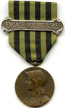 The medal hung from a ribbon passing through a ring itself passing through a ball shaped suspension loop at the top. The 36-mm-wide green silk moiré ribbon bore four 4-mm-wide equidistant vertical black stripes, the whole forming nine alternating 4 mm stripes.[3] The clasp "ENGAGÉ VOLONTAIRE" (English: "VOLUNTEER ENLISTEE") could be worn on the ribbon.[6]