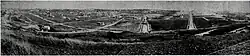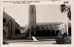 The church was founded in 1922 under the oversight of Rev. Marle Smith of Pasadena, who sought a new "assembly area" for the church that could support a summer camp and a youth institute.[9] The Pacific Palisades community was the successor to a Methodist church and community center called Alomar in Huntington Beach; in 1920, after a six-year search "they reported that a great assembly area modeled after that at Ocean Grove, New Jersey, was needed. In May of the following year 1,100 acres in the Santa Monica area were purchased for $660 an acre. The Pacific Palisades Association was organized."[10] The Huntington Beach location was sold—apparently the discovery and development of the Huntington Beach Oil Field nearby created both an unpleasant place to worship and a good opportunity to sell real estate.[11] The proceeds from the sale of Alomar bought the bluffs from the Santa Monica Land and Water Company, the church conference set aside "certain space" for "institutional purposes," and the remainder was subdivided for sale.[10] From 1922 until 1929, congregants worshipped at a tent camp in Temescal Canyon and then in the Pacific Palisades Association building.[12][13][14] Another one of the Methodist institutions established, circa 1921, was the Pacific Palisades Rest Home Society, a retirement home for deacons and deaconesses, an institution that was later relocated to Alhambra.[15] Brush fires in Topanga threatened the Pacific Palisades project in 1924.[16]
