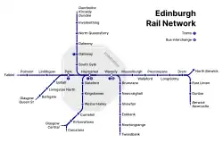A project to open a rail link to Edinburgh Airport was cancelled in September 2007 by the Scottish Government in favour of construction of an Edinburgh Gateway station at nearby Gogar, which connects with the Edinburgh tram network to take passengers to the terminal.[20] A proposal to re-open the Edinburgh suburban railway line has been made by campaigning groups.[21]