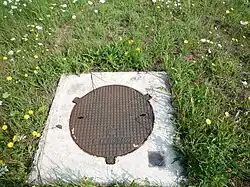 A sugar mill was then set up on the pit site, followed by a wire-drawing mill.[5] In the 20th century, the five-meter-diameter well was used to supply water to the wire-drawing plant, which required 200 m³ per day. The water level was twelve to thirteen meters deep in 1957, and the measured depth of the structure was 35 meters.[19] In 2007, the DRIRE installed a materialized wellhead, enabling monitoring of water and embankment levels, as well as gas pressure.[23] It now stands in the middle of the roundabout on the Tréfilerie industrial estate. It is called “Puits 2 Marchiennes.”