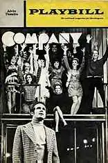 Company is a musical with music and lyrics by Stephen Sondheim and book by George Furth. The original 1970 production was nominated for a record-setting 14 Tony Awards, winning six. Company was among the first book musicals to deal with contemporary dating, marriage, and divorce,[1] and is a notable example of a concept musical lacking a linear plot.[2] In a series of vignettes, Company follows bachelor Bobby interacting with his married friends, who throw a party for his 35th birthday.[3]
