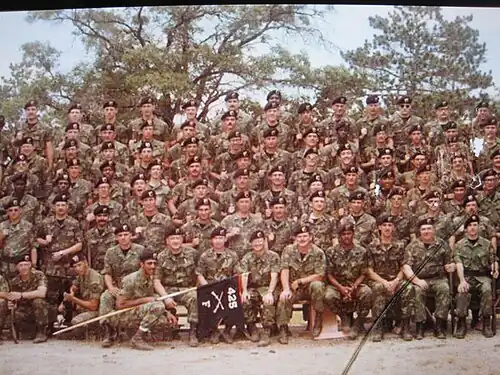 Company F consisted of a large company headquarters and operations section, three patrol platoons, a communications platoon, and a parachute rigger section. Each patrol platoon consisted of a platoon headquarters and, at full strength, six 6-man patrol teams. Company F was historically an independent company within the Michigan National Guard, but for a period during the Cold War beginning in 1983, the company was aligned with VII Corps Headquarters in Stuttgart, West Germany, where it would deploy and serve as the corps Long Range Surveillance unit in the event of a NATO-Soviet conflict in Europe. Members of Company F held military occupational specialties (MOS) in the branches Infantry, Quartermaster Corps (Parachute Rigger 92R), Signal Corps and Military Intelligence. Since it was an airborne unit, members were required to attend the Army's Basic Airborne Course at Fort Benning, GA.[1]