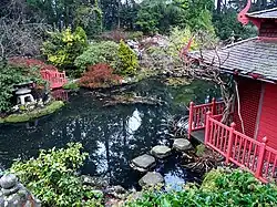 The Tea House, draped with Japanese wisteria (Wisteria floribunda) and the thatched summerhouse, are constructed to authentic designs while the stone and bronze works of art were imported from Japan in the 1920s. The plants have been chosen with the emphasis on Japanese icons such as the colourful, evergreen Kurume hybrid azaleas, Japanese maples, and beautiful Asiatic flowering shrubs.