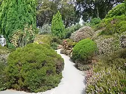 The plantings are a mixture of many species of heathers. Recent plantings of Southern Hemisphere plants, many not hardy in more inland sites, including the spectacular Acacia pravissima, provide special interest.