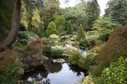 The mature pine wood has been developed as a woodland garden with winding pathways and dramatic waterfalls.