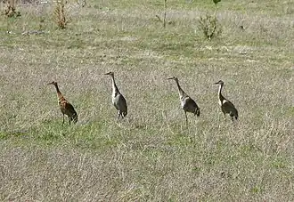 Each spring, juvenile sandhill cranes, called colts, can be observed from near the refuge headquarters and from the nearby roads. When the birds are very young they are difficult to see because the adult birds try to hide their offspring from predators. Visitors are encouraged to observe from a distance and in such a way that their presence does not threaten the survival of the birds.[5]