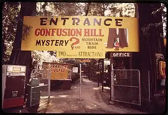 Confusion Hill is a roadside attraction in Piercy, California. The attraction, which opened in 1949, includes what is dubbed as a "gravity house", a structure built to give the interior visitors tilt-induced optical illusions, similar to the perspective on a gravity hill. Occupants experience the need to stand upright when they actually already are. Also included in the attraction is the Mountain Train Ride a 1+1⁄2-mile (2.4 km) 20 in (508 mm) narrow gauge built in a switchback layout along the side of a steep hill.
