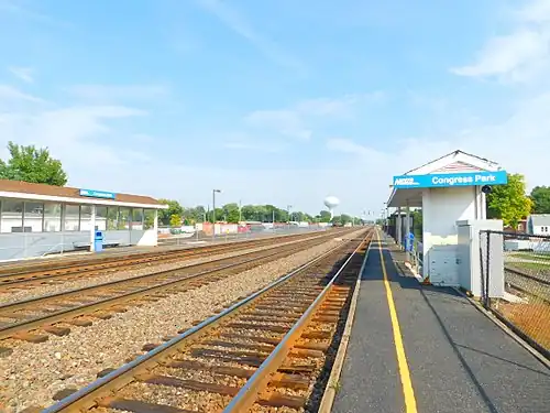 Congress Park is one of three stations on Metra's BNSF Line in Brookfield, Illinois. The station is 13.0 miles (20.9 km) from Union Station, the east end of the line.[2] In Metra's zone-based fare system, Congress Park is in zone 3. As of 2018, Congress Park is the 128th busiest of Metra's 236 non-downtown stations, with an average of 368 weekday boardings.[1] Shelters are on both sides of the tracks. Metra trains serve Congress Park in the peak direction on weekdays only. As of February 16, 2024, 13 inbound trains service Congress Park in the morning rush and 11 outbound trains stop here in the evening rush.