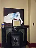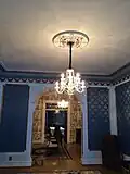 The first parlor, also known as the "blue room" or "Music room" features blue wallpaper inside of decorative wall moldings and is the scene of most seasonal celebrations. During the Christmas season the largest tree is placed in the bay window of this room. It houses the grand piano and Victrola, among other instruments.
