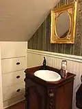 The interior features elaborate and extensive woodwork, quarter-sawn oak floors throughout the house, one of the longest cantilevered staircases on the East Coast of the United States, a large and ornate antique Eastlake-style chandelier in the dining room, and the only known existing installation of M.H. Birge & Sons block-printed peacock wallpaper ca. 1915. The home was constructed by the owners of Conklin Wagon Works, one of Olean's most important industries in the late 19th century. It was subsequently owned by the Mountain family, who operated the Mountain Clinic Infirmary, and is currently an owner-occupied single family residence not open to the public. On the morning of October 8, 2023 the house caught fire, resulting in the residents being displaced and a total loss of the historic interiors.[2]